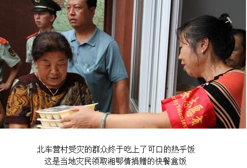 北車營村村長翟瑞生說,“村民已吃了近一周的方便面,湘鄂情送來的飯菜讓大家特別高興,終于可以換換口味,品嘗到新鮮可口的熱飯熱菜了。”