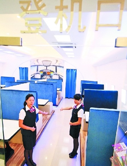 “歡迎登機!”一進入餐廳,你就能看到服務員彎著腰,做出歡迎的手勢!拔覀兊姆⻊諉T都是參考空姐的標準來招收,要求身高160cm以上,長相清秀,笑容甜美等!秉S慧玲介紹說,服務員統一著空姐制服,上班前還得接受餐飲禮儀和空姐服務方面的培訓。