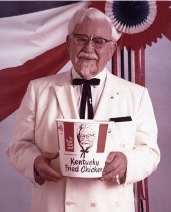 創(chuàng)始人桑德斯上校創(chuàng)辦肯德基時66歲,靠每月的$105社保生活。在肯德基獲得成功而接受電視臺采訪時,他找出自己唯一一套干凈的、白色棕櫚裝,從此這一打扮成為他獨特的標(biāo)識造型,并以此注冊商標(biāo)。從此以后,人們便將這套西裝與肯德基聯(lián)想在一起;而他的這身白西裝,滿頭白發(fā),及山羊胡子也成為了全國性的象征。因為生意做的好,肯德基州長于1935年封他為肯德基上校,以表彰他對肯德基州餐飲的貢獻。