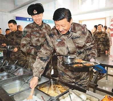 2014年1月26日,習近平在內蒙古軍區邊防某團一連食堂排隊就餐。