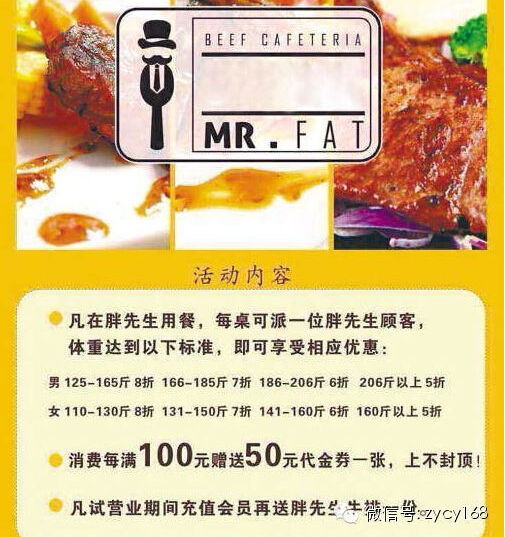 每桌可派一位胖先生顧客,體重達到以上標準,即可享受相應優(yōu)惠。