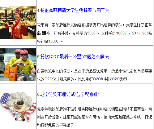老字號(hào)狗不理包子引進(jìn)咖啡連鎖店,包子配咖啡的混搭引起網(wǎng)友熱評(píng);臨近春節(jié),餐飲服務(wù)員緊缺,有餐企特別歡迎大學(xué)生寒假兼職餐館服務(wù)員,并給予特殊補(bǔ)貼;據(jù)統(tǒng)計(jì),2014年餐飲業(yè)收入數(shù)據(jù)終于回升,2015年將向3萬(wàn)億目標(biāo)邁進(jìn)。