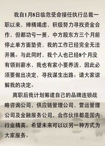 只可惜短短4個多月的時間,戚東就已招架不住,提出辭職。其在辭職信中坦言,自接任總裁一職以來,積極努力尋找資金合作,但都功虧一簣。中方股東也在三個月前就已經(jīng)停止單方面墊資,使得運營工作完全無法開展。而他本人已經(jīng)有8個月沒有領(lǐng)到薪水。