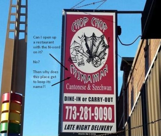 網(wǎng)友吐槽飯店名稱:“我能以N開頭那個詞(指Nigger,黑鬼)做餐館名嗎?”、“不能”、“那這家為什么可以叫中國佬?”