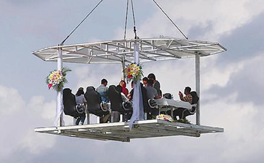據(jù)聞,“空中餐廳”四周不設(shè)圍欄,享受餐飲服務(wù)的價(jià)格為每位8888元?吹健翱罩胁蛷d”被起重機(jī)吊著緩緩升空,不少圍觀市民嘖嘖稱奇,紛紛舉起相機(jī)、手機(jī)拍照留念,并感嘆:“這是用生命在吃飯呀!”、“這吃的不是飯,而是刺激體驗(yàn)!”。