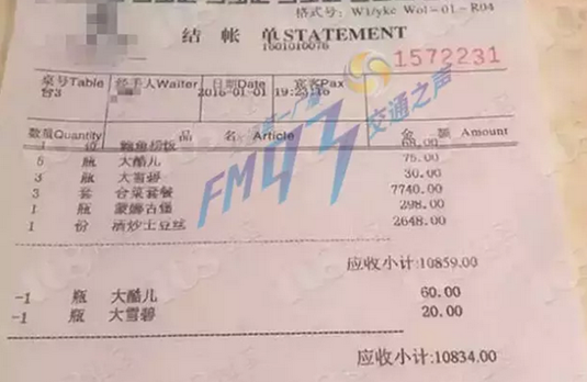 這份菜單來自某賓館,消費(fèi)時(shí)間為新年第一天,1月1日晚上。菜單顯示:合菜套餐3套7740元,大酷兒5瓶75元,大雪碧3瓶30元,蒙娜古堡1瓶298元,清炒土豆絲一份2648元,共計(jì)10859元。