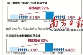 數據顯示,前三季度,全市新登記各類商事主體19萬戶,同比增長22%,新登記商事主體增速為近兩年來最高。截至2016年9月底,全市實有各類商事主體146.7萬戶,高出全國平均增速8個百分點。