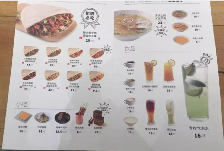 菜單整體以九種口味的肉夾饃搭配“小吃+熱湯+飲品”呈現,包含水盆羊肉、嫩豆腐肉湯、燕麥小米粥和咖啡等7款飲品,以搭配肉夾饃的口感。