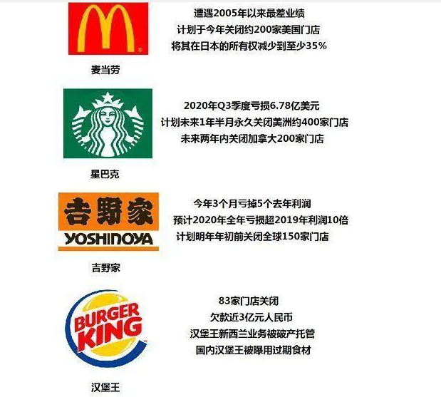 在新冠疫情的影響下,不只是吉野家關店自救,麥當勞關店200家,星巴克關店400家……為應對危機,曾經在全球“開疆拓土”的國際餐飲知名品牌紛紛關店。